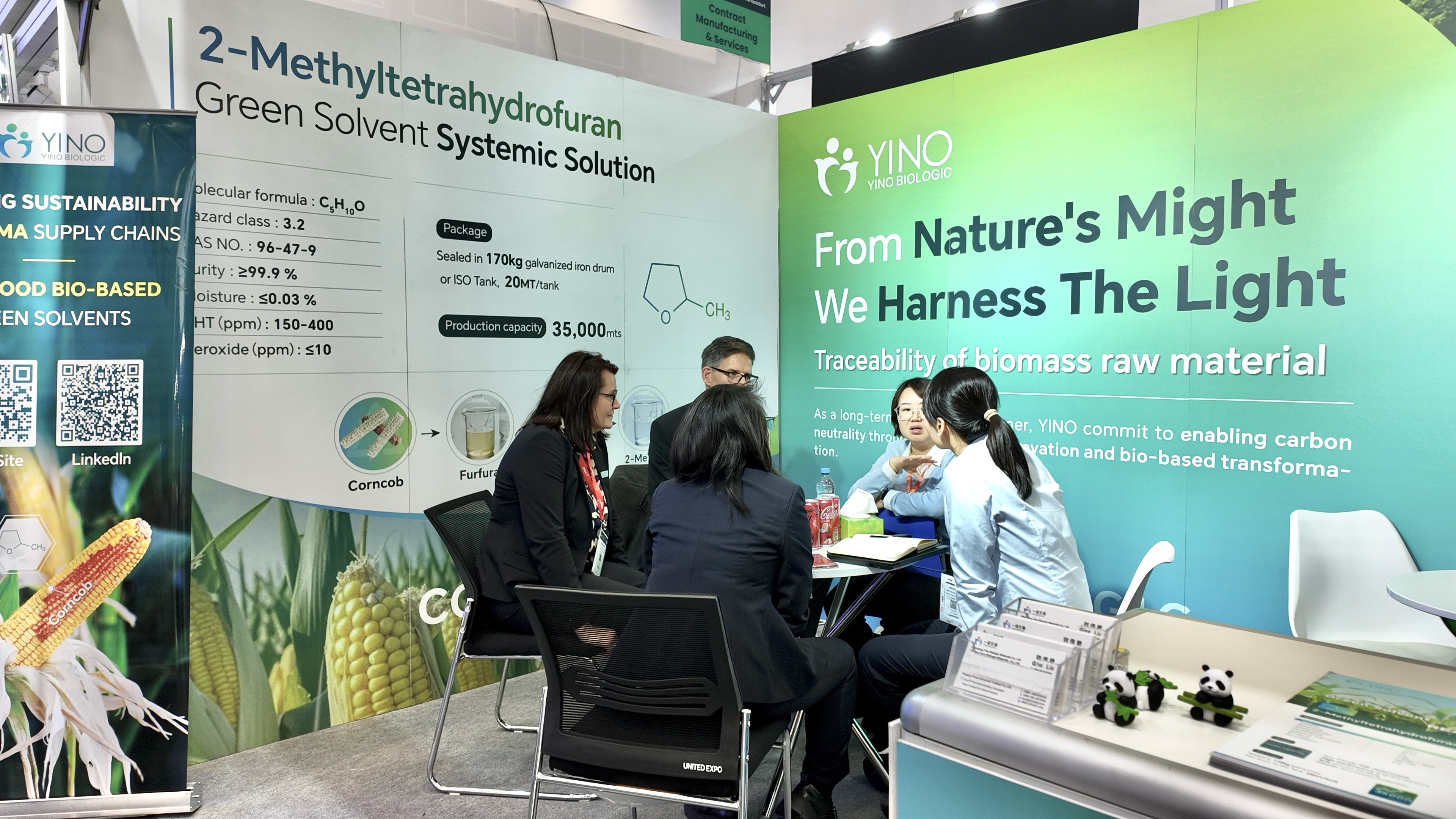 在制藥生產(chǎn)中,溶劑與原料的選擇不僅關系到工藝的安全性與環(huán)境友好性,更直接影響藥物純度和生產(chǎn)效率。YINO Biologic 以非糧生物質(zhì)玉米芯為原料,從源頭實現(xiàn)碳減排與資源高效利用,構建了覆蓋從原料到終端制造的綠色供應鏈。本次展會上,公司重點展示了多款高性能可持續(xù)產(chǎn)品,包括可作為活性藥物成分(API)合成綠色溶劑的 2-Methyltetrahydrofuran(2-MeTHF),該產(chǎn)品可有效替代傳統(tǒng) THF,顯著降低揮發(fā)性有機物排放并提升反應安全性與效率;用于高端藥物保護基及精細化工中間體合成的關鍵原料 3,4-Dihydro-2H-Pyran(DHP);以及新一代高純度環(huán)狀酯原料 δ-Valerolactone(δ-VL),廣泛應用于藥物輔料及聚合物開發(fā)領域,充分展現(xiàn)了 YINO 在綠色化學與可持續(xù)材料創(chuàng)新方面的實力。